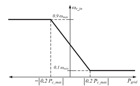 If Pgrid is close to zero (for one side or another), the state of charge varies linearly with Pgrid, among adopted values +/- 0.2 of the maximum power of the controller. 0.2 Pc_max is chosen due to: A) at lower values, the FESS could go from maximum to minimum load (and vice versa) extremely quickly, and B) at higher values, the FESS could be working constantly since the reference is always changing. In addition, a low pass filter (LPF2) is placed at the output of this control block to limit abrupt changes in the reference due to variations when the power is close to zero.