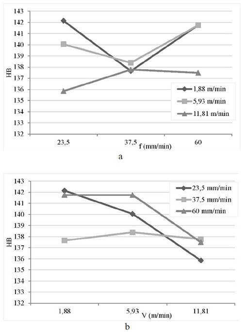 Fig. 1, shows the effect of feed rate (a) and cutting speed (b) on the hardness of the machined workpiece. The increase of feed rate caused an initial decrease and then an increase in hardness for the lower cutting speeds, while for V = 11,81 m/min, hardness first grew and then tended to remain constant.