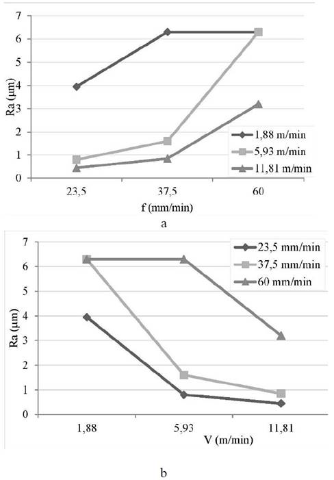 The increase of feed rate (Fig. 2a) caused an increase in the surface roughness value, while the increase of cutting speed induced the reduction of roughness (Fig. 2b).