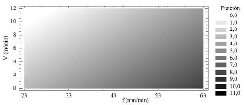 The multifactorial analysis of variance (Table 4) shows that the values of P are lower than 0,05; so the feed rate and cutting speed have a statistically significant effect on the surface roughness, at 95,0 % confidence level. However, the interaction of these two factors does not have a significant effect on the dependent variable, since the value of p is greater than 0,05.
