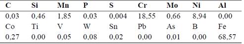 AISI 304 steel in the hot rolled condition was the material chosen for the present study. It was provided in the form of plate with dimensions 800 mm x 20 mm x 20 mm. Its chemical composition was determined using a spectrometer of spark emission, and is presented in Table 1.