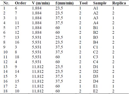 Three cutting speed and three feed rate, as well as a constant depth of cut (0,5 mm), and two replicates were included, leading to 18 experimental runs. Tests were randomized to minimize influences of the cutting tool wear and operator on the results. The machining experiment was stopped every pass to record the surface roughness (Ra) and hardness (HRB) of workpiece. The matrix of experiment is presented in Table 2.