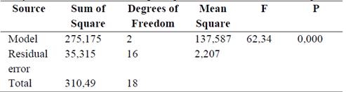 The F-value of the analysis of variance of the model is less than 0,05 (there is a statistically significant relationship between the variables with a confidence level at 95,0 %).