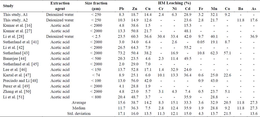 The results of the leaching test performed in A1 and A2 showed that the HMs with higher leaching percentages were Mn and Cd (Table 4). On average, the sequence in leaching tests was the following one: Mn (26.9%) > Cd (26.3%) > As (17.6%) > Zn (16.8%) > Cu (13.5%) > Ba (11.8%) > Pb (9.3%) > Co (9.2%) > Ni (6.3%) > Fe (3.0%) > Cr (2.4%). Average leaching for all HMs under study was 14.1%. Table 4 shows similar results reported by other studies. Nevertheless, differences in the HM leaching tests probably related to the agent and time of extraction, temperature, agitation system, and RDS size fraction were observed. The median of the leaching percentage for all HMs reviewed in Table 4 was 11.8%; median was used as central-tendency measure due to the existence of extreme values in the information reported in Table 4.