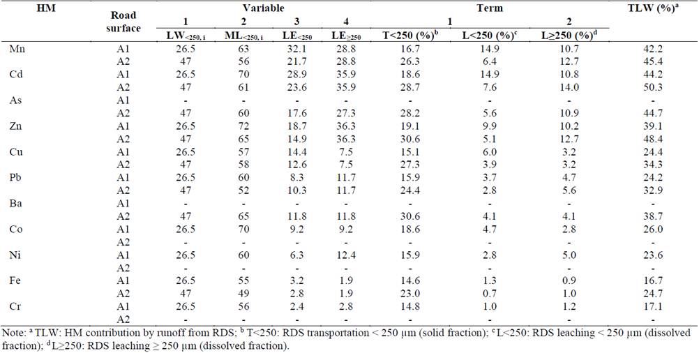 Where TLW was the HM contribution washed-off by runoff from RDS (%), LW<250, i was the percentage of RDS with size below 250 μm susceptible to transportation (see Table 2), ML<250, i was the percentage of HM load associated with RDS of size below 250 μm (see Table 3), LE<250 was the percentage of HM leaching associated with RDS of size below 250 µm (see Table 4), and LE≥250 was the percentage of HM leaching associated with RDS of size greater than or equal to 250 µm (see median for each HM in Table 4). The median was used as a central-tendency measure in light of the extreme values in the information reported in Table 4. The term (1-LW<250, i/100) represented the RDS proportion with size below 250 µm that was not transported by runoff, but which provided HM by leaching.