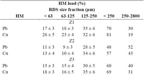 On average for Z1, Z2, and Z3, 70%, 48%, and 60% of the total Pb load was associated with the RDS size fraction below 250 µm, respectively. For Cu, there was evidence of a higher association, and more specifically 81%, 57%, and 69%, respectively (Table 6).