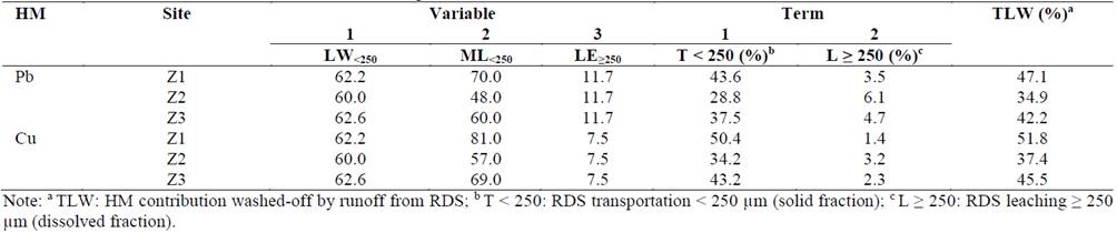 Where TLW was the HM contribution washed-off by runoff from RDS (%), LW<250 was the percentage of RDS with size below 250 μm transported by runoff, ML<250 was the percentage of HM associated with RDS of size below 250 μm (Table 6), and LE≥250 was the percentage of HM leaching associated with RDS of size greater than or equal to 250 µm (see median in Table 4). The term (1-ML<250/100) indicated the HM proportion associated with the RDS size fraction greater than or equal to 250 µm (Table 6).