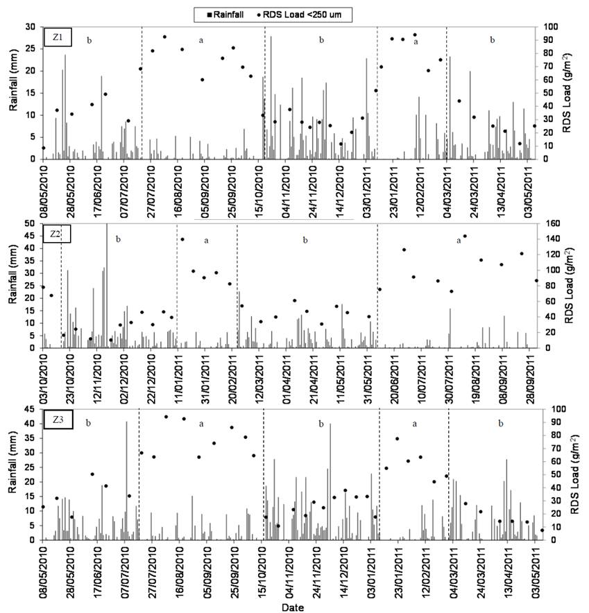 The climatic characterization of RDS load was focused on the following: (i) identification of the climatic periods of dry and rainy weather in the study areas, and (ii) quantification of RDS load (mass quantity of RDS) for each climatic period. Additionally, during the development of the proposed method (A1 and A2), the susceptibility of the RDS to wash-off by runoff (percentage difference relative to the RDS mass before and after each rainfall event) was analyzed as a function of the particle diameter for all rain events during the study period. Finally, we assumed during the application of the proposed method (Z1, Z2, and Z3) that the difference in the RDS load between these climatic periods (i.e., dry and rainy weather) represented the average load washed-off by runoff in rainy weather.