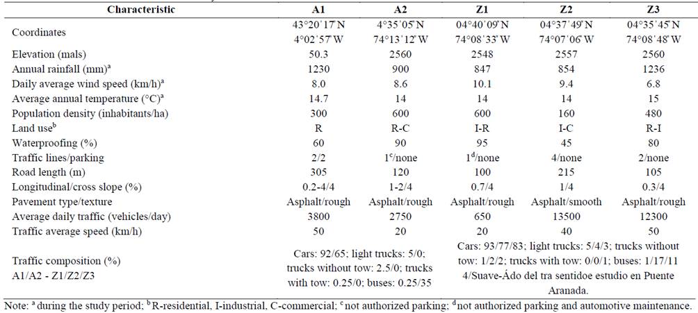 The two road surfaces for developing the method were in the cities of Torrelavega (Spain, A1) and Soacha (Colombia, A2); Soacha belonged to the metropolitan area of Bogota city (Colombia). A1 road surface was used to validate the results obtained on A2 road surface. Climate data were obtained from stations located at a distance between 300 and 340 m from the road surfaces under study. The three road surfaces to which the proposed method was applied were in Bogota city. These three road surfaces were situated in Fontibón (Z1), Puente Aranda (Z2), and Kennedy (Z3). The climate data were obtained from stations located 10, 38, and 194 meters away from the road surfaces under study, respectively. In A1 road surface, the Atlantic climate (warm) was characterized by abundant rains throughout the year, high humidity, and mild temperatures. In A2, Z1, Z2, and Z3 the Tropical mountain climate (cold) was characterized by abundant rains during the year and a wide variation in temperature (hourly variation between 5 and 22 °C). Table 1 shows the main climatic and physical characteristics of each road surface.