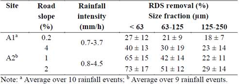 The analysis of susceptibility of the RDS to washing by runoff showed on average for the size fraction below 250 µm, that the percentage of RDS transported by runoff during all rainfall events in A1 (asphalt, slope = 0.2-4%, rainfall intensity = 0.7-3.7 mm/h, Atlantic climate) and A2 (asphalt, slope = 1-2%; rainfall intensity = 0.8-4.5 mm/h, tropical mountain climate) was 26.5% and 47.0%, respectively (Table 2). Zhao and Li [52] reported an average RDS wash-off between 15.8% and 11.6% for the size fraction below 1000 µm, using a rainfall simulator (asphalt, slope = 4.1%, rainfall intensity = 46.7 mm/h, humid continental climate).