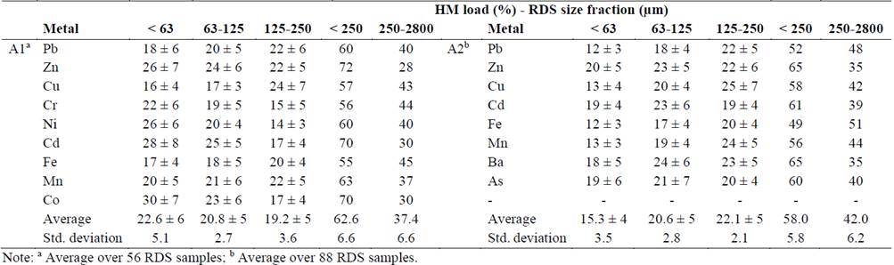 After comparing the results obtained during the development and application of the wash-off equation, we noted that the terms associated with the RDS size fraction below 250 µm contributed, for all HMs under study, 82.4% and 91.3% of the total HM load washed-off by runoff, respectively. The results suggested that the percentage associated with this RDS size fraction tended to increase during the application of the reduced wash-off equation, probably because of the elimination of the leaching phenomenon included in the first term of eq. (1). In other words, the total HM load associated with RDS of size below 250 µm was assumed to be transported by runoff with it.