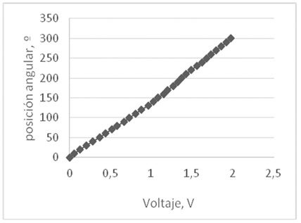 It was necessary to test the power system regarding its instrumentation for measuring the angular position at the output of the power unit because these data are essential for recording and updating the rehabilitation treatments in the patient medical records. Calibration of the linear potentiometer was performed by measuring potentiometer voltage versus its angular position; the results were plotted and are shown in Fig. 5. The function obtained in Equation 1 was used in programming the microcontroller, to obtain the desired angular position in degrees (º).