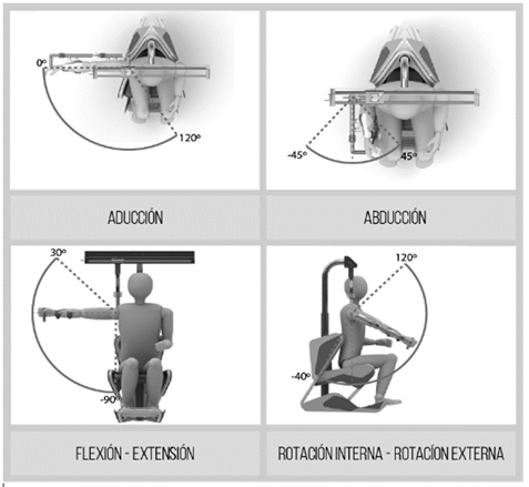 The assistive technology device for shoulder rehabilitation allows the patient to perform active and passive rehabilitation movements in three degrees of freedom, which are shown in Fig. 6; this means that patients recover mobility and muscle strength in six joint movements. These three degrees of freedom are achieved using the power unit coupled to the mechanical system.
