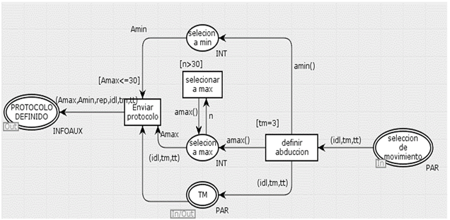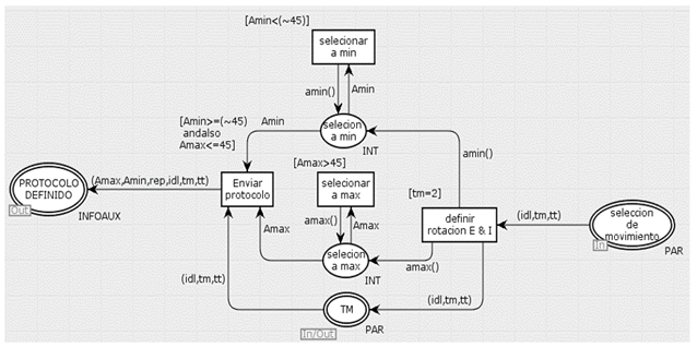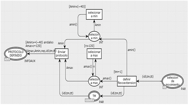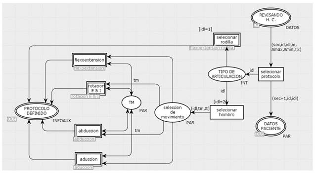 In Fig. 9, each movement shown is a substitution transition, which means that it is a new net characterizing each movement independently. Figs. 10-13 show each movement for rehabilitation; this modeling is necessary for characterizing each movement in terms of its maximum and minimum ranges and for decision-making when a protocol is poorly defined by the specialist.