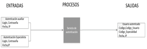 Fig. 15 shows the authentication service model, representing its inputs and outputs. This service is responsible for authenticating users and providing them with an interface, according to their role as a specialist or assistant.