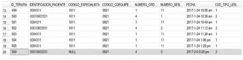 The patient search is recorded in the database; its record is shown in Fig. 26. This database contains general information and that related to rehabilitation, as well as administrative information such as the medical order, which defines the type of injury and injured side.