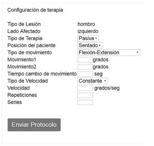 Next, the events related to the communication web service are shown. This service is mainly linked to the input and output information of the assistive technology device. As shown in Fig. 27, in the specialist's interface, specialists have the possibility of filling the fields related to the rehabilitation protocol. Unlike knee rehabilitation, the specialist can choose between six anatomical movements to be performed by the shoulder. It should be noted that some fields cannot be modified because they are defined by the treatment order entered in advance into the database. The reason for this is to reduce the possibility of errors by the specialist because of not having direct patient contact.