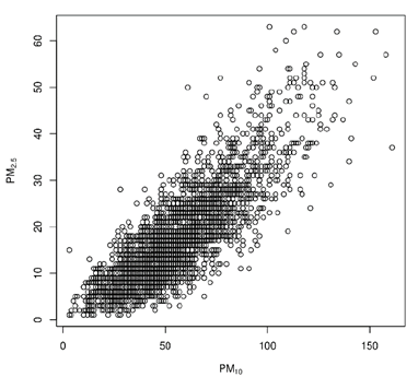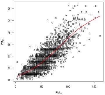El diagrama de dispersión de la Fig. 1 muestra la relación entre la concentración de PM10 y PM2.5. El coeficiente de correlación lineal es 0.83. En el proceso de depuración se suprimieron las observaciones que mostraban niveles de PM2.5 mayores que los niveles de PM10. Los mínimos de ambas variables están muy cerca al origen, como podría anticiparse ya que si el PM2.5 es una fracción del PM10, entonces el PM2.5 debería ser nulo si no se observara presencia en el aire de partículas PM10.