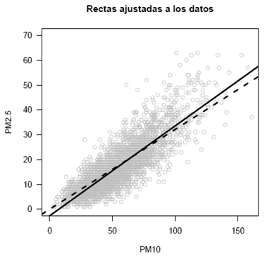 Nótese que el modelo sin intercepto mejora la estimación para valores pequeños de PM10, en el sentido que no estima valores negativos. Pero para valores altos de PM10, el modelo sin intercepto introduce una subestimación de los valores de PM2.5, como se ilustra en la Fig. 2. En defensa del modelo sin intercepto, los valores altos de PM10 son menos frecuentes.