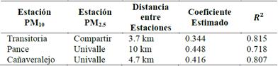 El uso de la metodología de modelos lineales entre estaciones parece ser coherente en el contexto de contaminantes aéreos siempre y cuando se presente similaridad de condiciones y cercanía entre las estaciones, dado que en estos casos los estimadores de los parámetros son similares. Por tal motivo se propone como una alternativa para proponer una estimación de la concentración horaria de partículas finas en el aire en sitios en los cuales se mide solo un contaminante, ya sea PM2.5 o PM10.