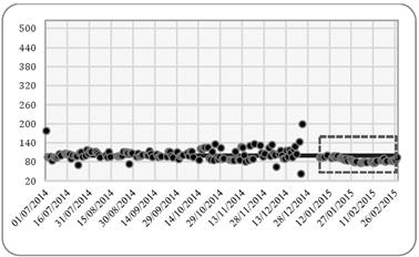 Una vez se obtuvo la línea de tendencia o línea base conforme al periodo de estudio, se establecieron los indicadores de desempeño energético: Índice de Consumo-IC, Tendencia o Sumas Acumulativas-CUSUM e Indicador base 100, estos se representaron a través de gráficas que simbolizan diferentes comportamientos que impactan la eficiencia energética, según como se detalla en las Figs. 2-4. Finalmente se realizó un seguimiento al rendimiento energético en los meses de enero y febrero del 2015.