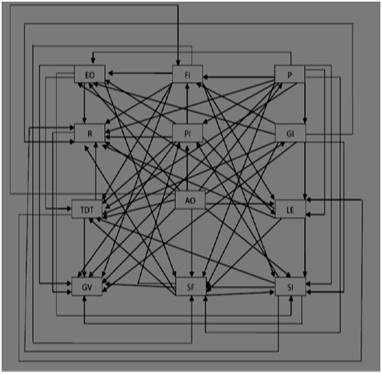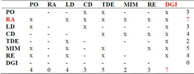 La identificación en cada etapa del proceso de Dirección Estratégica de las variables causas y efectos constituye una fortaleza del instrumento, ya que permite realizar un análisis de las variables en función de sus interrelaciones e identificar los elementos limitantes cuyo desempeño frena el del resto de las variables con las que se relaciona y por ende el desempeño del sistema. La determinación de estas relaciones se realiza a través de las herramientas Diagrama de Relaciones e Inograf. En el caso del Inograf la cruz representa que la variable de la fila incide o es causa de la variable de la columna por lo que el número de la última columna es la suma de todas las cruces de la variable de esa fila, la variable de mayor número en esa columna se considera la más causal del sistema. Los números de la última fila es la suma de las cruces de las variables de la columna, en este caso la de mayor número en esa fila se considera la variable efecto del sistema. A continuación