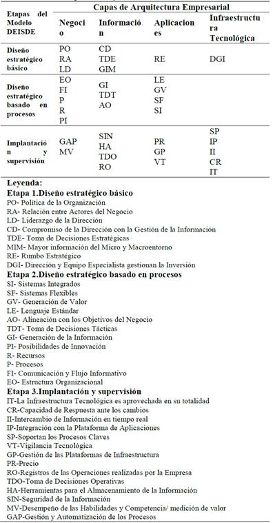 El modelo DEISDE está compuesto por tres etapas fundamentales: Etapa 1:Diseño estratégico básico: cuyo objetivo es definir el rumbo estratégico de la organización y preparar a la dirección y los trabajadores para el gran cambio, Etapa 2:Diseño estratégico basado en procesos: esta etapa se enfoca en la evaluación de las relaciones entre los procesos claves y funcionales para agregar valor a los productos y servicios a partir del cumplimiento de los objetivos estratégicos, y Etapa 3:Implementación, supervisión y ajuste: tiene como objetivo poner en práctica y supervisar un conjunto de acciones de mejora a las relaciones de bajo desempeño encontradas en la etapa 2. Teniendo en cuenta el objetivo de estas etapas y la funcionalidad de cada variable de AE se agruparon estas últimas dentro de las etapas utilizando como herramienta fundamental el Diagrama de Afinidad. La Tabla 1 muestra los resultados de esta asociación.