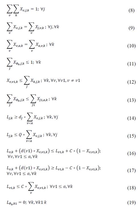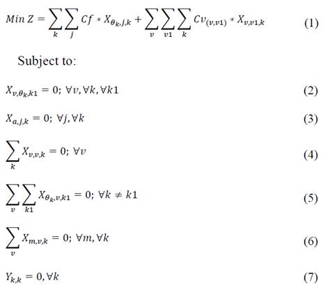 Let the problem be mathematically defined on a directed graph G={𝑣,𝑒}. The set 𝑣: 𝜃 𝑘 ∪ 𝑗 ∪ 𝑎 ∪ 𝑚 , where 𝜃 𝑘 <𝑗<𝑎<𝑚. That is, the set of nodes 𝑣 is composed by a set 𝜃 𝑘 of bases where buses are located at the beginning of the journey, the set 𝑗 represents the students to pick up. The total number of students in the system is denoted by the constant 𝐶. The vertex 𝑎 represents the Autopista Norte highway, and the vertex 𝑚 represents the destination school. We assume that set 𝑘 denotes the set of available buses, each with a maximum capacity of 𝑄 students, and a fixed cost of used of 𝐶𝑓. Let set 𝑣1 be a copy of set 𝑣; set 𝑗1 be a copy of set 𝑗; and set 𝑘1 a copy of set 𝑘.