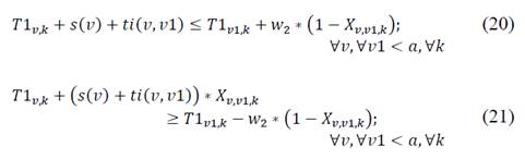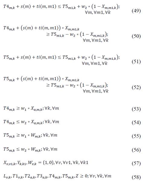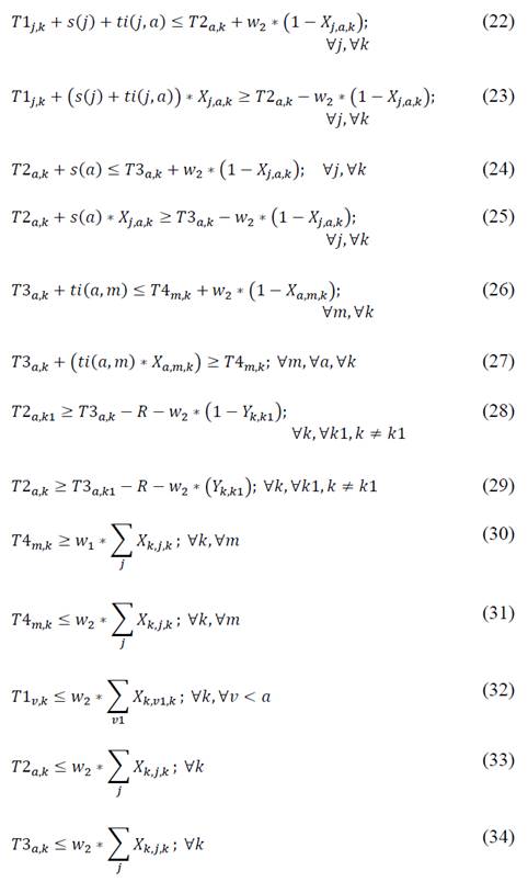 The third group of constraints controls the time variables and guarantees the right sequencing of buses at the highway. Expressions (20) to (27) limit the time from the moment bus k starts a route, picks up students, and travels along highway a, until it finishes in school m. Expression (28) guarantees sequencing when bus k precedes bus k1, by respecting a minimum amount of time R, in which bus k1 cannot enter the highway. Eq. (29) guarantees the consistency between arrival time of bus k to the highway and the leaving time of bus k1 to the highway when bus k does not precede bus k1. Further, eq. (30)-(31) guarantees that children arrive on time to schools (within the time window). Expressions (32)-(34) guarantee that if a bus k does not start a route, its time T1, T2, and T3 are not calculated.