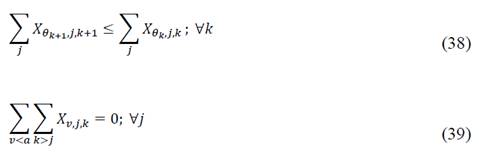 Finally, the fourth group of constraints (35)-(36) guarantees the nature of the binary and positive variables, respectively. The previous groups of constraints lead to the single load base model. Moreover, there is a last group of expressions known as valid inequalities, which increase the efficiency of the model. Details will be given in section 5. Expression (37) avoids the generation of sub-trips between two nodes visited consecutively. Eq. (38)-(39) guarantee that routes are generated in ascending order.