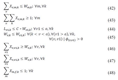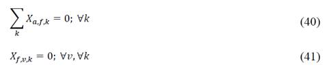 The first group of constraints contains the expressions (2)-(5) and (7) of the single load model. The added expressions (40) guarantees that going directly from the node a to the fictitious node is not allowed (used in the mixed load as final point of routes), and (41) guarantees that bus k does not visit more nodes after finishing the route on the fictitious node f.