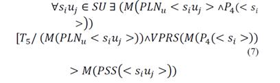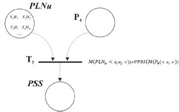 Donde, C es el color asignado a las diferentes identidades. C=N ∪ S ∪ U. Donde N es el subconjunto de lugares coloreados que representa el comportamiento normal S={S 1 , S 2 S 3 ,…S n } representando el conjunto de posibles servicios en la base de datos que tiene la empresa ( ej. Papel, computadoras, impresoras), U={U1,U2,U3…Um } representan los proveedores disponibles que pueden ofrecer el servicio, SU={S 1 ,S 2 , S 3 …S n }, la unión S∪U representan el servicio de marcas requerido y proveedor seleccionado. Dos de las principales transiciones se pueden ver en la Fig. 2, La transición T 4 puede ser disparada sólo para el color < S 1 …S n > Donde n es el número de posibles servicios. Asimismo, el T5 transición puede ser disparado sólo para el color <S 1 U 1 …S n U m > Donde m es el número de posibles proveedores. PSS, es el lugar de selección de proveedores, donde se tendrán en cuenta los criterios de calificación tanto cualitativos como cuantitativos [4].