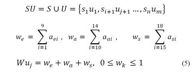 El conjunto de pesos genera una matriz Wuj, obtenidos en la autoevaluación realizada al proveedor de entrada en cada uno de los atributos por criterio de sostenibilidad. El peso de cada criterio de sostenibilidad económico, ambiental y social de los proveedores (w e , w a y w s ) respectivamente.
