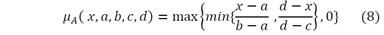 Un número difuso A trapezoidal se denota con cuatro elementos A=(a,b,c,d), con una función de pertenencia representada así: