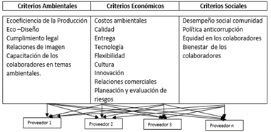 Existen diferentes estudios que han abordado la selección de proveedores los cuales han permitido determinar una variedad de criterios. Los criterios económicos hacen referencia a un adecuado manejo de los recursos financieros y su contribución para lograr la satisfacción de los accionistas, clientes, empleados y de la propia empresa [15] [16-19]. En referencia a los criterios ambientales se logran a menudo mediante un adecuado consumo de energía y eficiencia en el uso de los recursos y mitigando la generación de residuos, entre otros [18-21]. El proveedor por otra parte debe dar cumplimiento en los criterios sociales, en aspectos relacionados en la guía ISO 26000, los principios definidos por el Pacto Global y los indicadores de medición establecidos en el Reporte GRI.