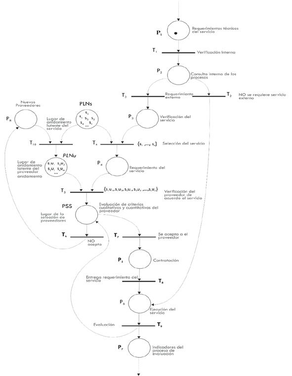 El lugar PLN u En el proceso de compras para cada servicio existen diferentes proveedores que puede suministrar el servicio con comportamiento normal donde las marcas se representan con lugares coloreados s 1 u 1 , s i+1 u j+1 …, s n u m para brindar los servicios requeridos por la empresa focal.