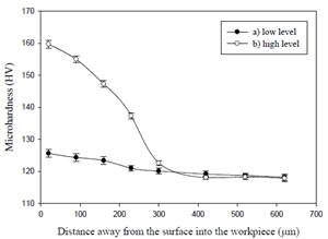 Figure 1: Microhardness profiles through depth after turning, a) low level (v = 20 m/min, f= 0.05 mm/rev, d = 1 mm), and b) high level (v = 70 m/min, f= 0.25 mm/rev, d = 3 mm).