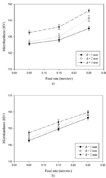 Figure 2: Microhardness plotted against feed rate for the turned annealed AISI 1020 steel, with a cutting speed of (a) 20 m/min; and (b) 70 m/min