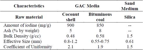 The characteristics of the GAC and sand filter media used in the test are given in Table 2.