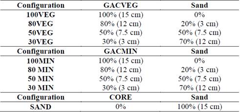 The configurations correspond to the height proportions of the filter media that consist of GACVEG and sand, GACMIN and sand and only sand. These configurations are presented in Table 3 and were analyzed in triplicate.