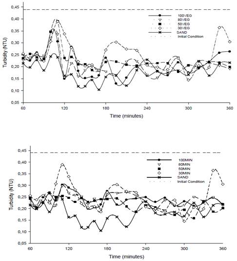 Figure 2: Behavior of the turbidity over time for the two types of activated carbon and sand with their respective configurations.