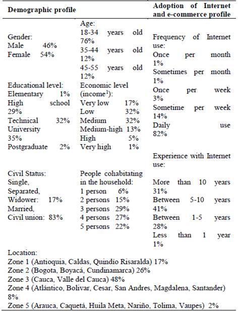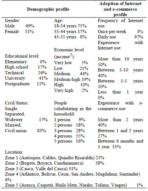The period for data collection occurred from November 2015 to May 2016. To achieve the objectives of the fieldwork, a national team with coordinators in each of the central cities was created to manage the distribution of the questionnaire. In addition, among the people who voluntarily responded to the survey, an incentive was offered, raffling a laptop that was given to the winner of the drawing held among all of the participants in June 2015 in Bogota and audited by the Gran Colombian Polytechnic University Institution (Institución Universitaria Politécnico Gran Colombiano). A total of 1,836 forms were obtained, of which 1,245 corresponded to online shoppers; 309 had consistency problems in the responses, and therefore, a final sample of 936 valid questionnaires for this group was obtained. Regarding the non-buyers, 875 forms were collected, and by eliminating 284 containing erroneous or inconsistent data, a final sample of 591 surveys for this group was obtained.