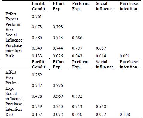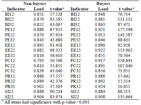 To close this first analysis, the UTAUT model for the purchase intention of two groups of Internet users in Colombia (buyers and non-buyers) is verified. For buyers, the results consistently validate the relationships between the predictor variables and the dependent variable, noting that the R2 is greater than 0.590 (Table 8), which reinforces that the model has measured a large proportion of the variables that a person takes into account to generate Internet purchase intention in general and according to previous studies of e-procurement in other countries [8, 40, 41, 66, 70]. For non-buyers, this study is one of the first to describe their intention to adopt e-commerce, equally validating the model as a good predictor of these relationships, with an R2 of 0.588 (Table 8).