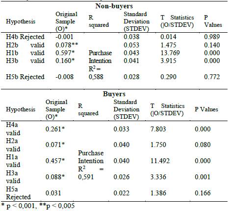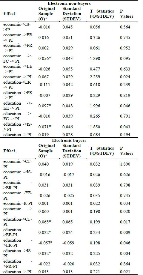 The moderating effect test for each of the model relations was applied, taking the socioeconomic status variable as the moderator. The results were that hypotheses H6g (B = 0.040) and H6h (B = 0.056) are significant for buyers, given that socioeconomic status exerts a positive moderating effect on the relationship between the facilitating conditions and purchase intention for both buyers and non-buyers. The remaining hypotheses are rejected (Table 9).