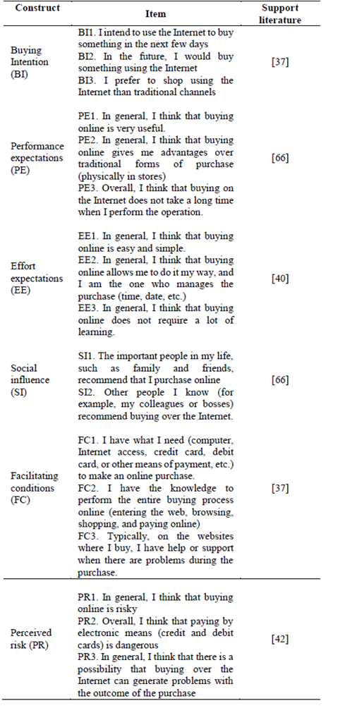 Because the goal is to compare two groups of Internet users differentiated in terms of being non-users and users of electronic commerce, as explained when we built the model, a unique analysis of the basic variables that affect the electronic purchase is presented to use the same evaluating tool for the two groups. To test the hypotheses of the proposed model, items acquired from previous literature were used, choosing the measurement scale adapted from the Spanish study for the general adoption of electronic commerce in Spain [42]. Similarly, to avoid comprehension problems with regard to the questions when using the language, a pre-test was performed using a group of 50 Internet users representing various cities in Colombia to evaluate each of the questions, without major changes in the proposed final tool (Appendix 1).