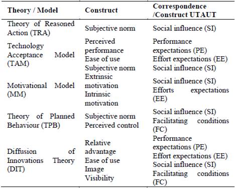 The main concepts that group all of the adoption theories in the UTAUT are the following: performance expectation, expectation of effort, social influence, and enabling conditions; all of these influence the intention and use of technology behaviour [37] (Table 1).
