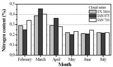 Variation of nitrogen content is presented in Fig. 7. It can be observed that nitrogen content increased during leaf development (March). This is because during this phenological stage, the demand for nitrogen changes according to biosynthetic activity for latex production. Nitrogen content for all the samples was within the ASTM 2227 standard specification for industrial processes [14], regarding that the maximum value recommended is 0.6%. Latex from IAN 710 clone showed some differences in nitrogen content when compared to lattices from the other two clonal series. Aristizabal et al. reported that the higher DRC corresponds to the lower nitrogen content, which is related to the phenological stage [9]. In our work, this behavior was not observed.