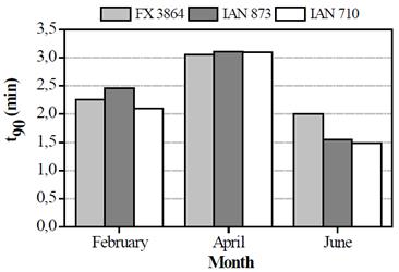 Figs. 8 and 9 show the variation in processing times according to rheometric tests. Compounds with NR tapped in April showed the highest processing times for the three clonal series. Differences in t90 and scorch time of clones could be related to changes in rubber plasticity and viscosity, due to the fact that of NR particles in latex are surrounded by a complex mixture of proteins, lipids, and fatty acids that can form long chains and interact with elastomer chains [16].