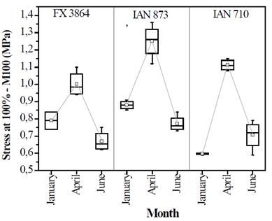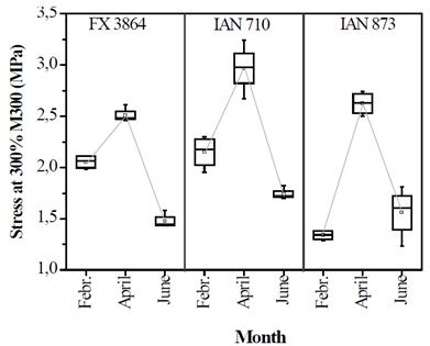 Moduli at 100 and 300 % of elongation in tensile tests for specimens cured according to rheometric tests are reported in Figs. 10 and 11, respectively. Compounds based on tapped NR in April showed the highest values of tensile moduli for the three clones. IAN 873 NR-based compounds had higher properties than the other clones. Some differences in tensile properties were observed over the time for each clone.