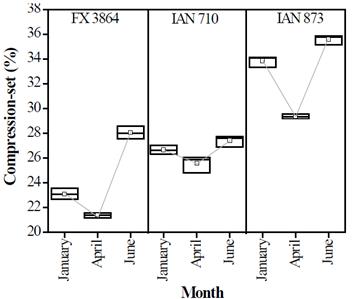 Uniaxial compressive moduli for specimens cured according to rheometric tests are reported in Fig. 13. Compounds based on tapped NR in April showed the highest values of compressive moduli for the three clones. For the other test conditions, some differences in compressive moduli were observed over the time and among clones. Compression-set for specimens cured according to rheometric tests are reported in Fig. 14. The best compression-set values were presented during April for the three clones. IAN 710 compounds showed the worst compression-set of the three clones. Uniaxial compression tests after compression-set were carried out for comparing the resistance to change the mechanical properties under the effect of time and temperature.